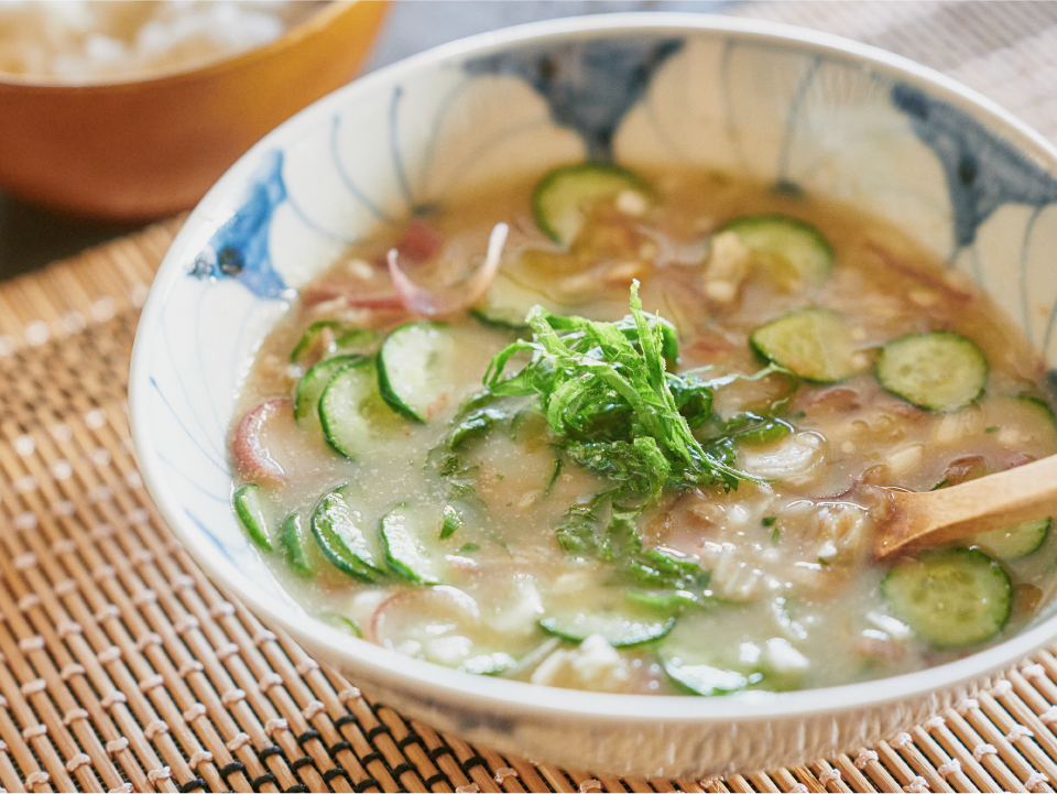 冷や汁とは、魚のすり身とお味噌、すりごまなどを冷たいだし汁で伸ばした宮崎県の郷土料理。今回は、だし子さん流の濃縮だしと、愛媛県産の義農味噌を使って仕上げました。国産原料100%の麦味噌の優しい甘さと、こだわりのだしの旨みを、ごはんにたっぷりかけてお召し上がりください。